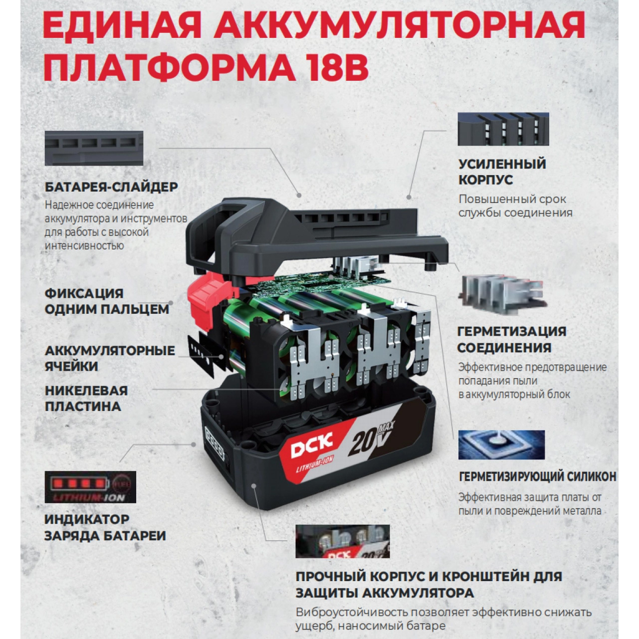 Аккумуляторная батарея DCK FFBL2080 представляет собой высококачественное устройство, обеспечивающее надежное питание для различных инструментов. Ее емкость составляет 8 Ач. Этот аккумулятор отлично подойдет для энергозатратного оборудования, такого как циркулярные или цепные пилы, садового инструмента. Надежность и эффективность - основные качества продуктов бренда DCK/