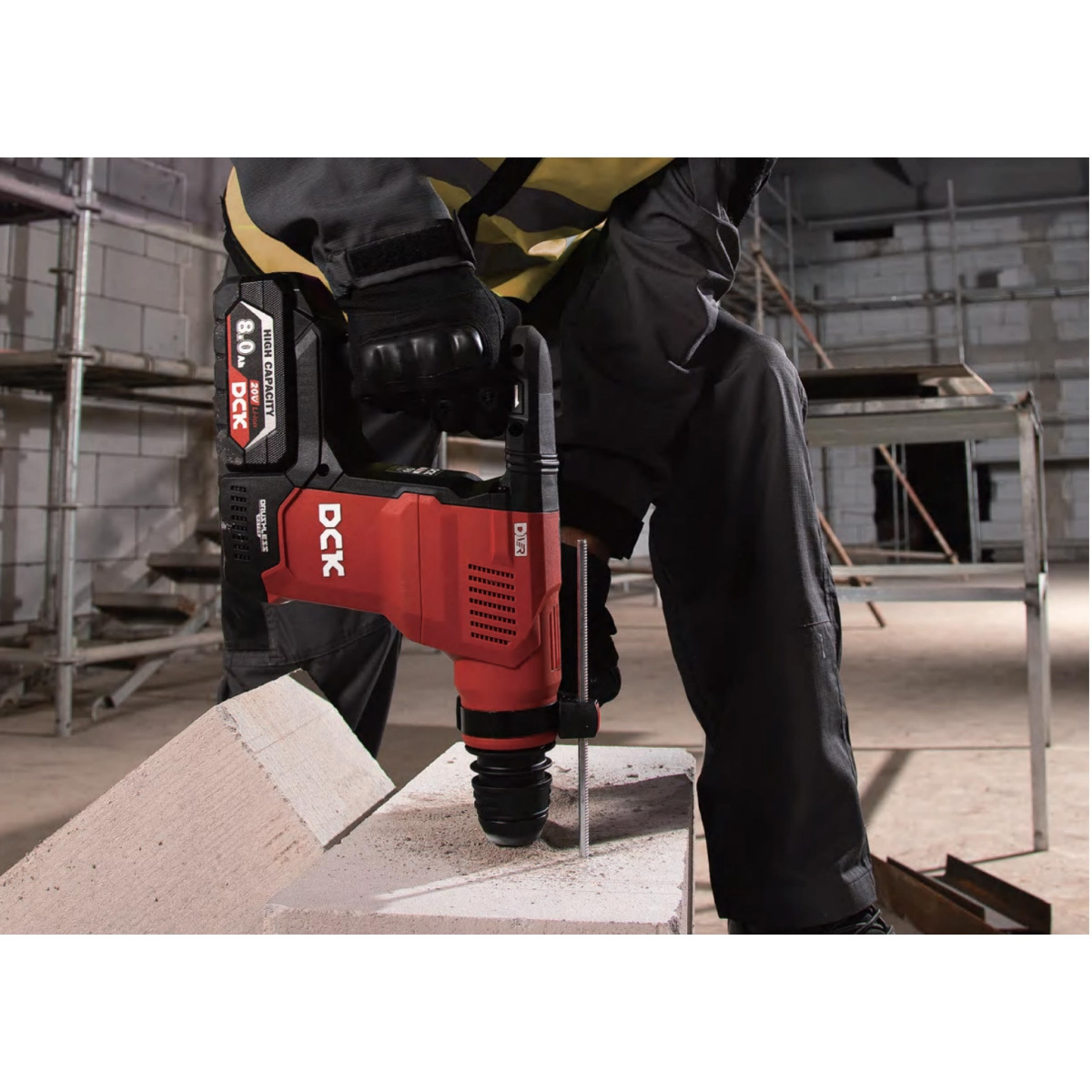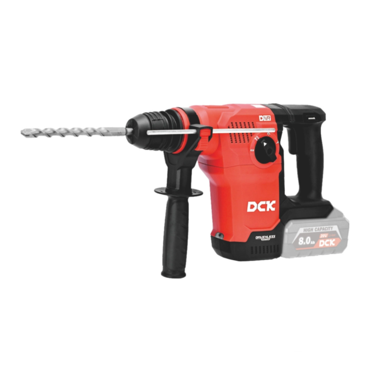 Аккумуляторный бесщеточный перфоратор DCK KRH20V-28 (TYPE Z) с вертикально расположенным двигателем подходит для интенсивного и длительного сверления. Наличие эффективной системы гашения вибраций в ручке перфоратора и хорошая балансировка существенно уменьшают нагрузку ра руки. Перфоратор работает от аккумуляторов с напряжением 18 В, развивает энергию удара в 3,6 Дж, имеет 3 режима работы, съемный патрон SDS-plus.